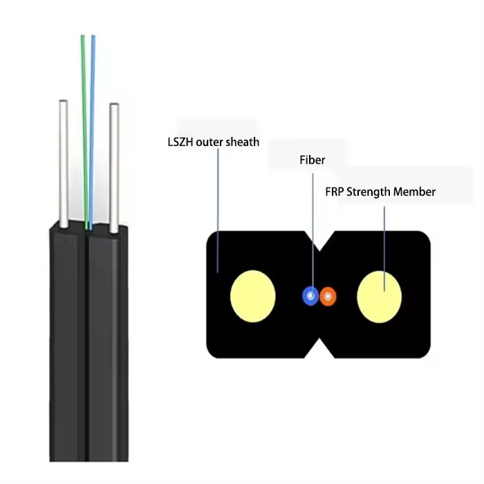Структура: Центральное оптическое волокно + две параллельные стальные проволоки + опциональная дополнительная стальная проволока + оболочка LSZH