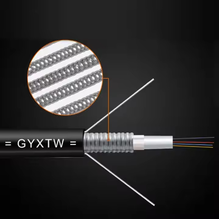 Волоконные кабели GYXTW используют одномодовые или многомодовые волокна, размещенные в свободной трубке из высокопрочного пластика, заполненной водостойким гелем. Слой PSP наматывается продольно вокруг трубки, а водоблокирующие материалы заполняют зазоры, чтобы обеспечить компактную структуру и надежную водостойкость. Два параллельных стальных троса армируют сердечник кабеля, а вся конструкция защищена внешней оболочкой из полиэтилена.