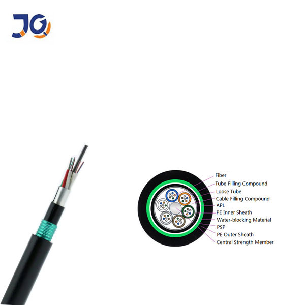 The 250µm fibers are housed in PBT loose tubes filled with water-blocking gel. A central steel strength member supports the core, with tubes and fillers stranded around it for a compact structure. The core is wrapped with APL for moisture protection, followed by a PE inner sheath. PSP armor is applied longitudinally, and the cable is finished with a durable PE outer sheath for direct-burial environments.